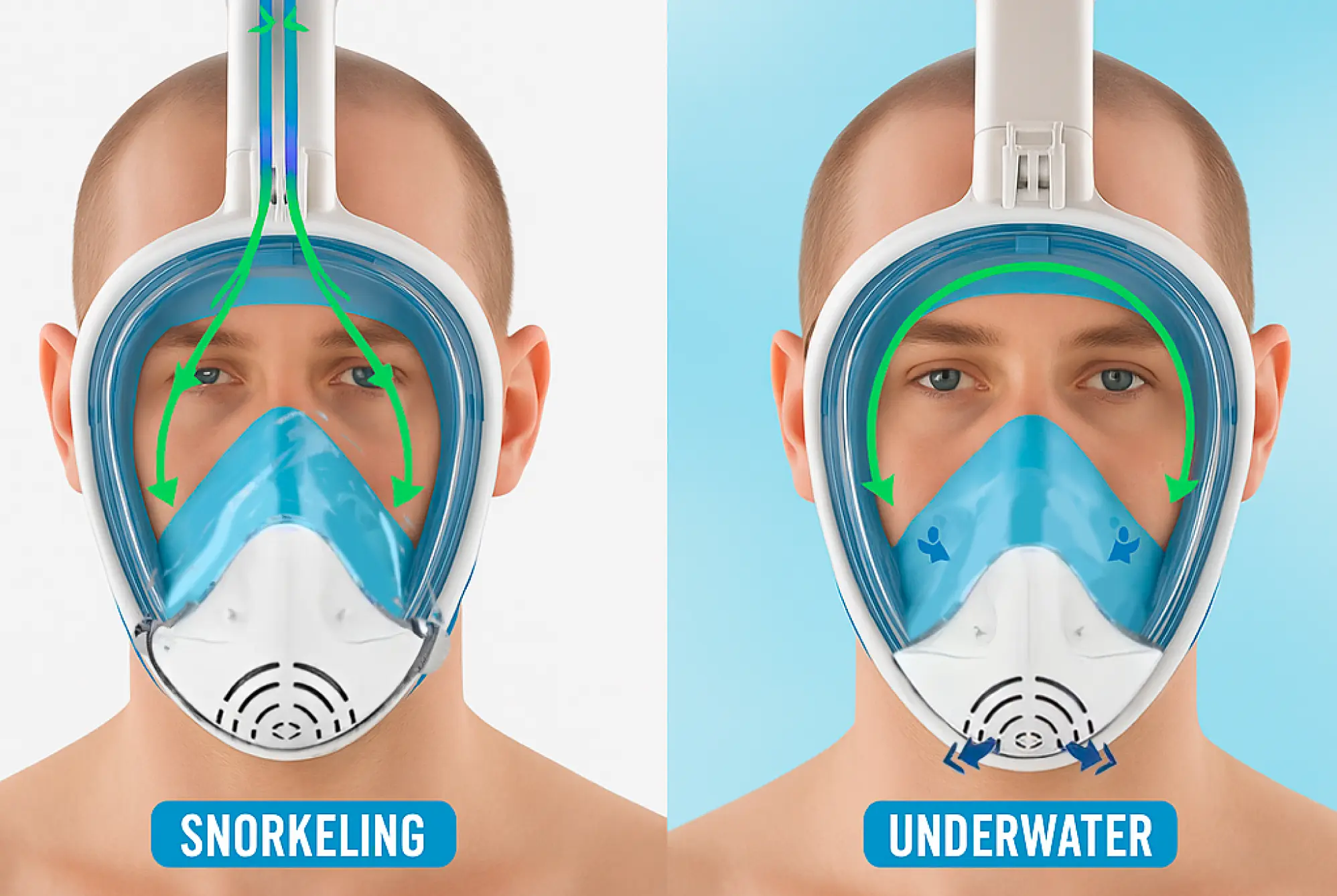 The air flows through separate channels, preventing fogging in the mask and ensuring a clear and crisp vision throughout the dive.