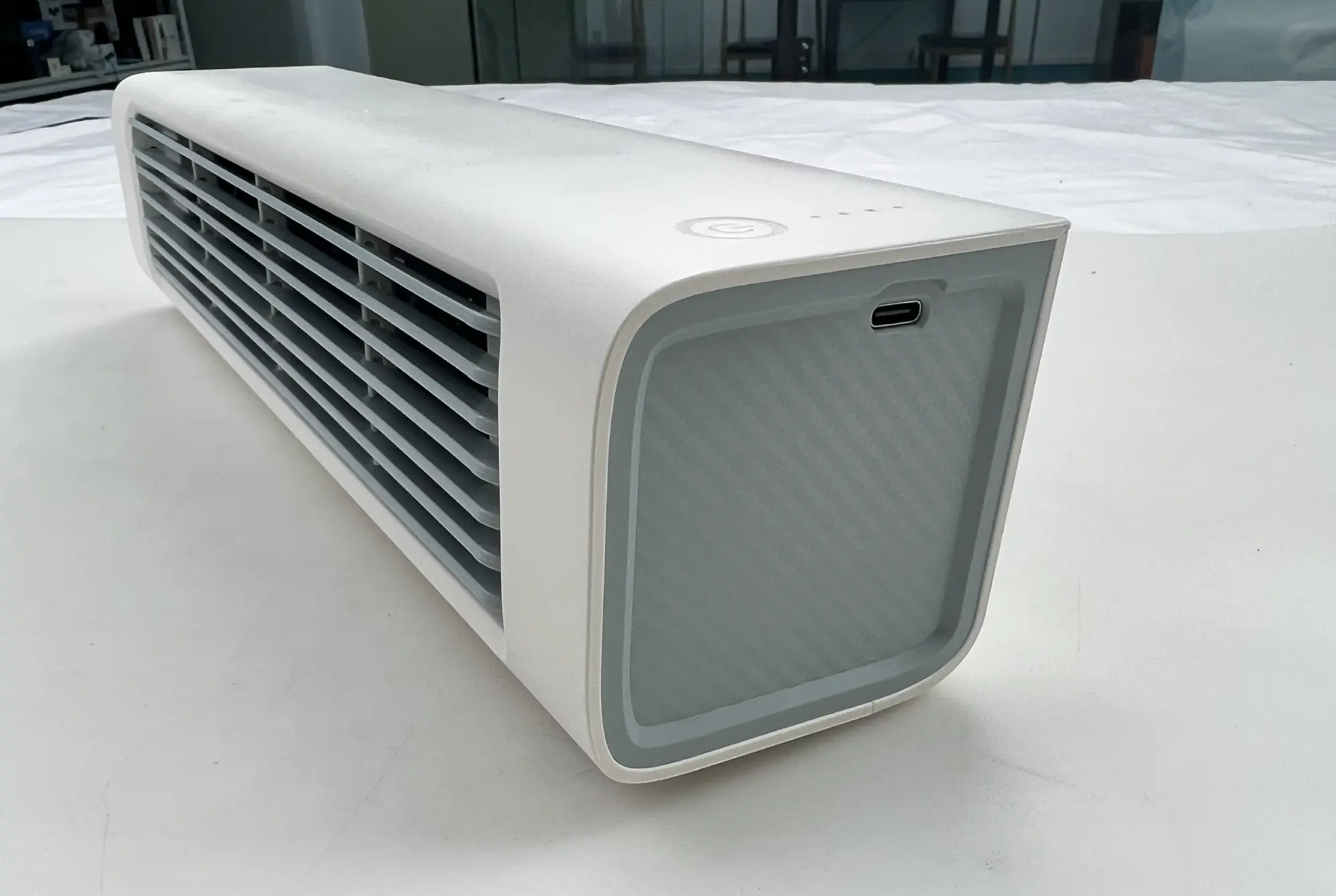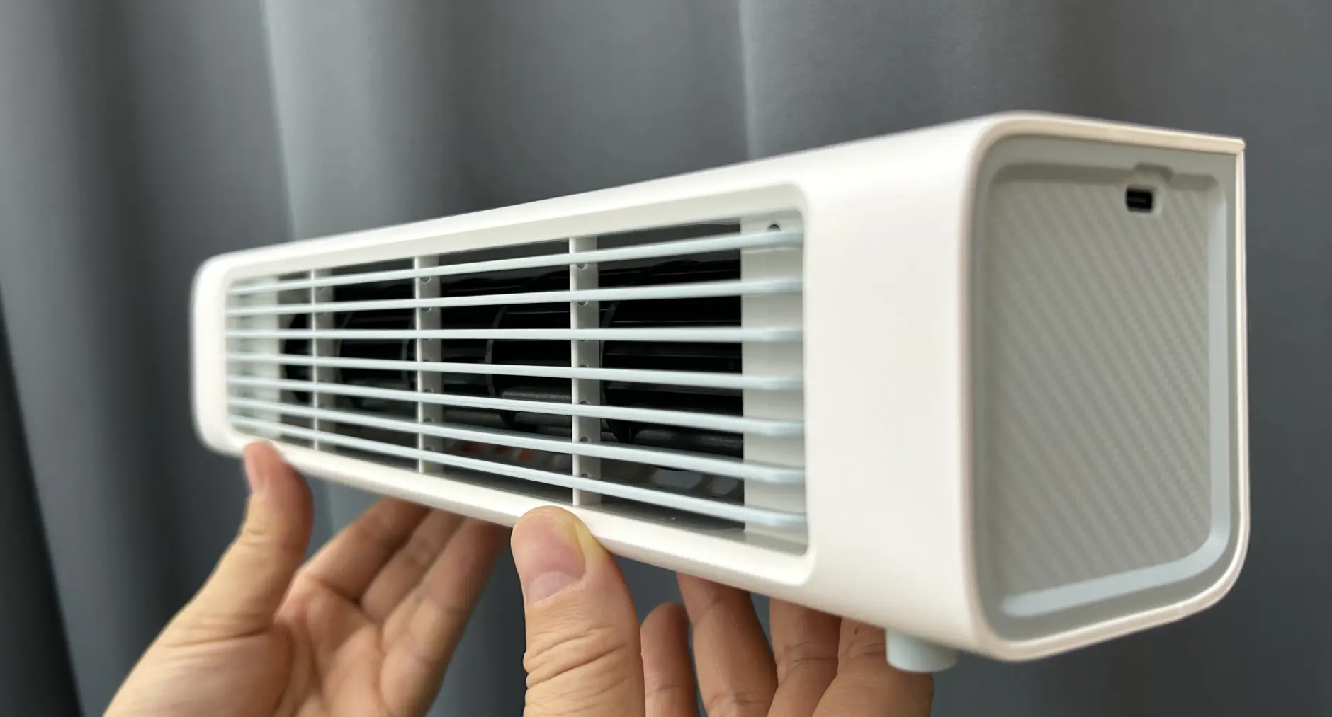 One of the most convenient things about the Qinux BreezaMax is that you can place it anywhere you want. Vertically, horizontally, or even hanging on the wall without needing to drill holes. I currently have it on a shelf in my office, but at night I put it on the floor next to the bed. A client of mine, who lives in a studio of just 25 square meters, told me that this Air Cooler is the best thing she's ever had: she puts it in any corner and it never gets in the way. It fits in with everything and doesn't take up space.