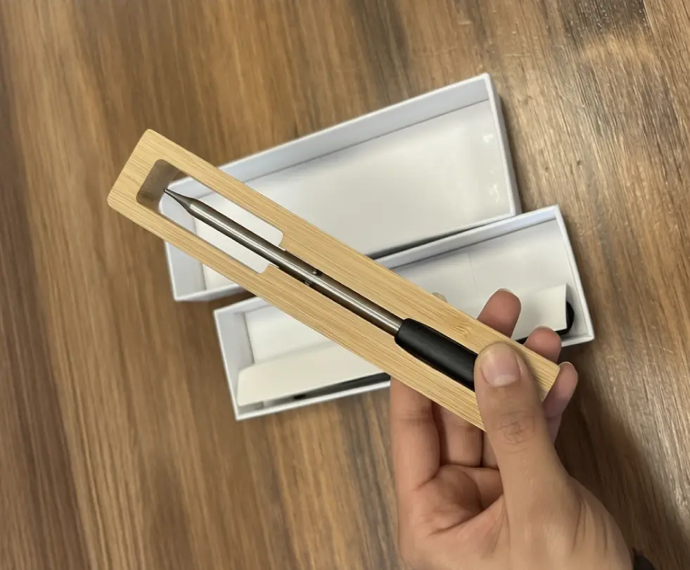 Qinux MeatMark is a smart wireless thermometer designed to take meat cooking to the next level. Thanks to its dual-sensor technology, it measures both the internal temperature of the meat and the ambient temperature, ensuring perfect doneness without the need to cut or constantly monitor.