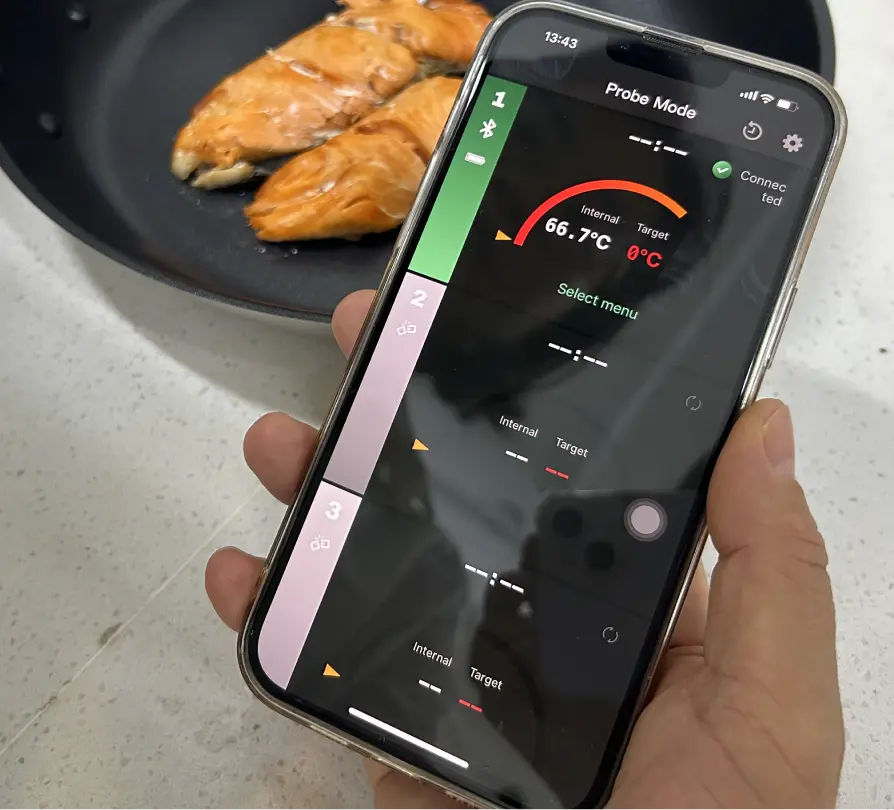 Via Bluetooth. Choose the type of meat and your preferred doneness.