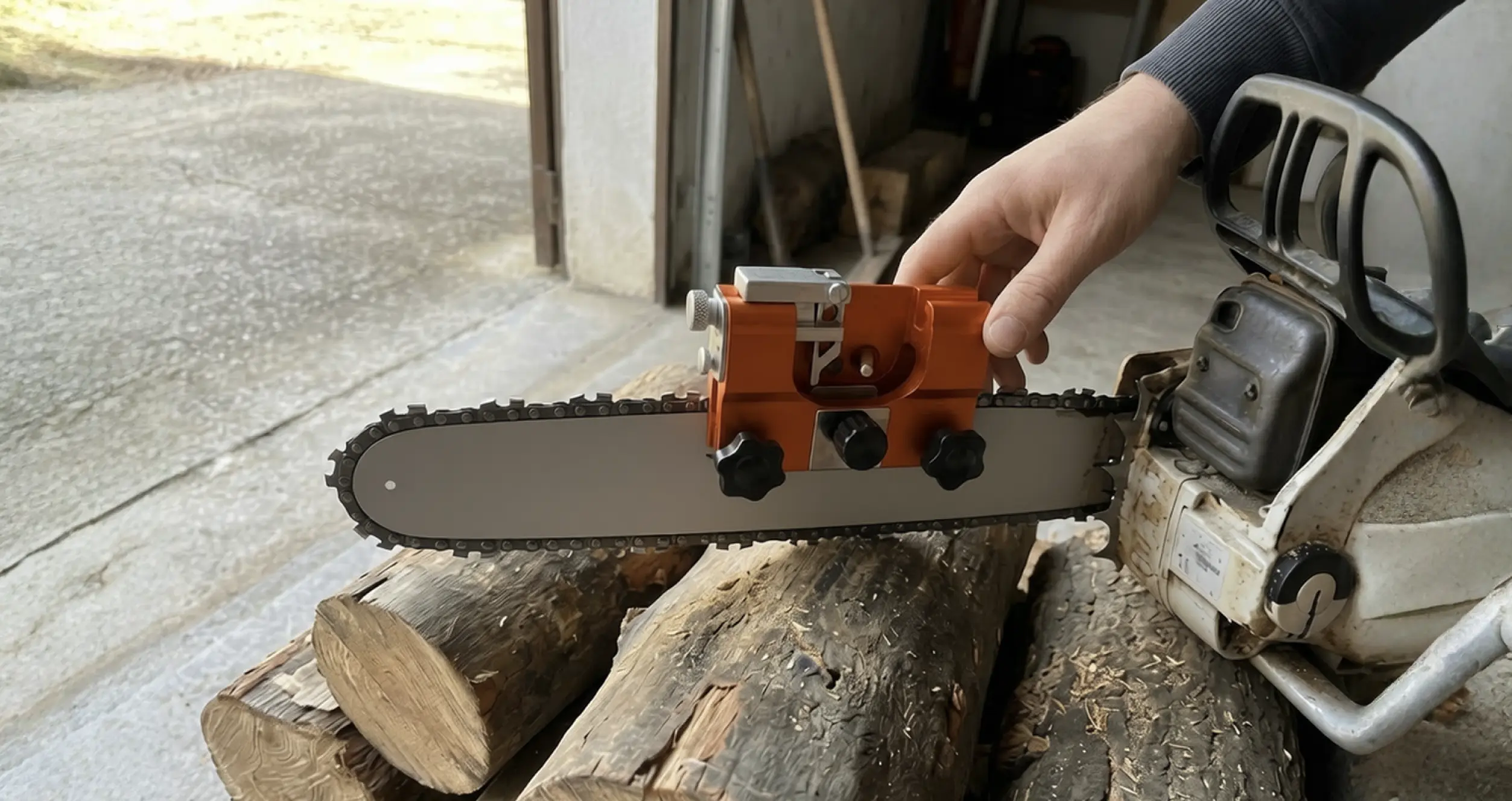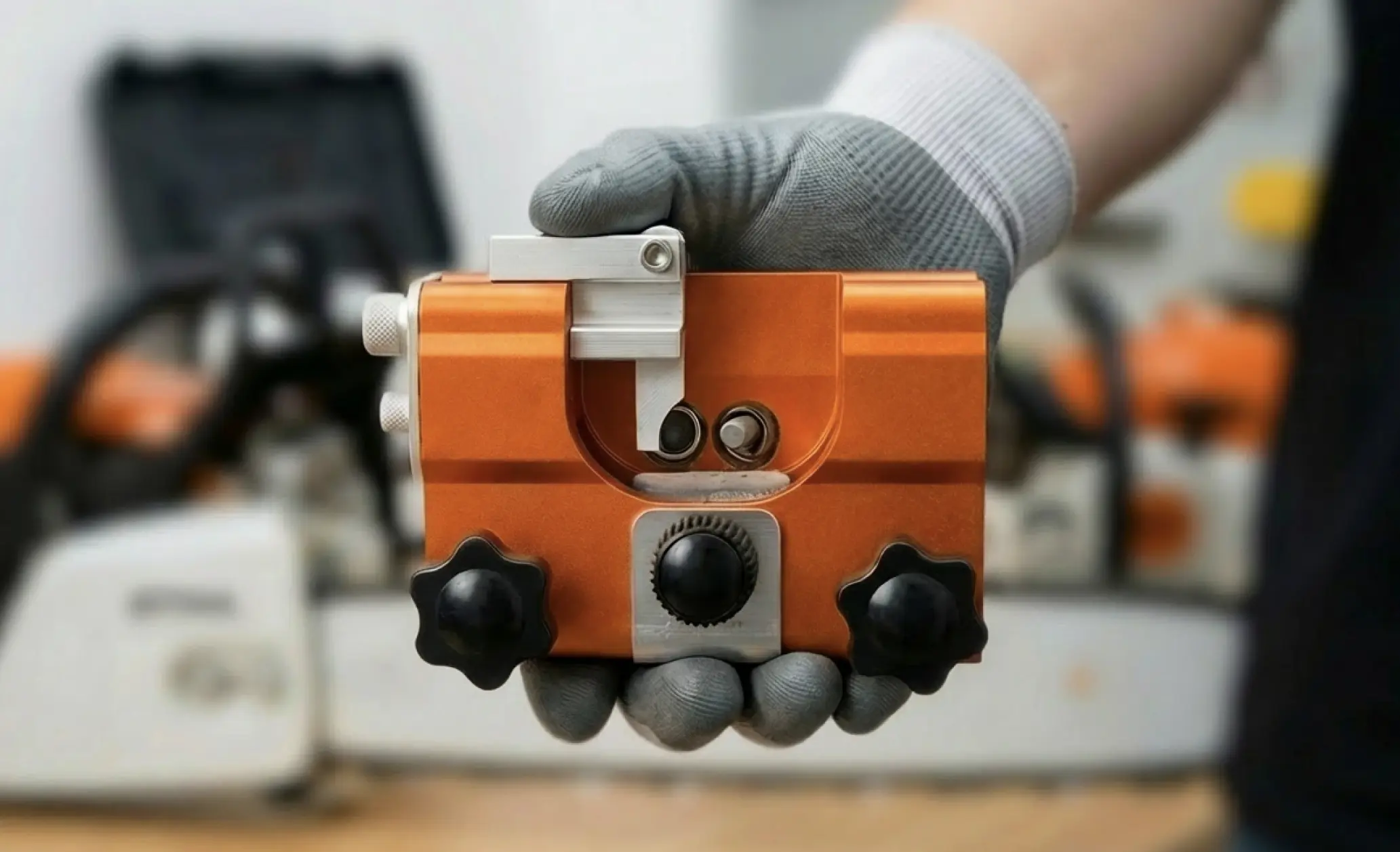 In the workshop, we're used to spending quite a bit of time on chain maintenance. With traditional methods, sharpening a chainsaw can require patience and a lot of practice to get a good result. However, with this guided system, the whole process becomes much simpler.